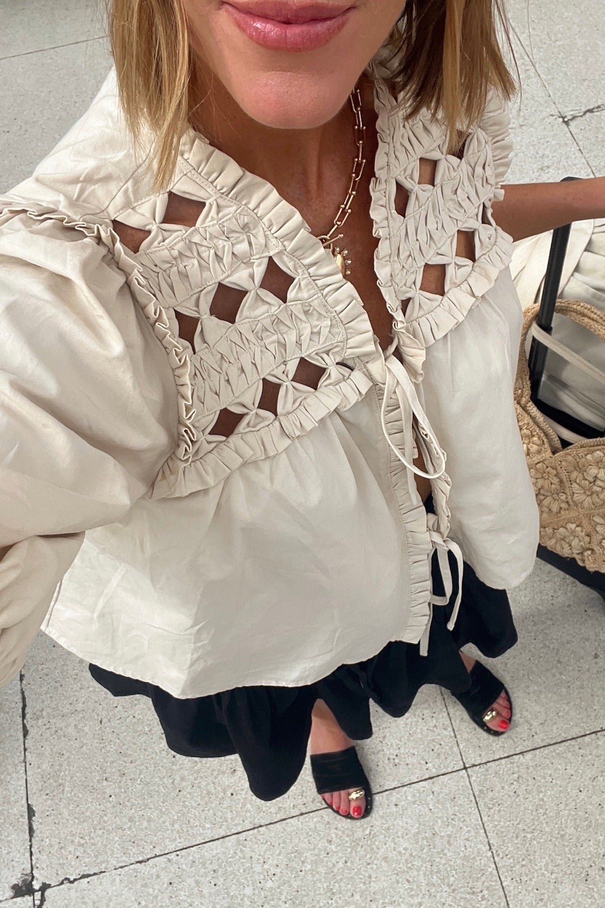 - Open front with tie details